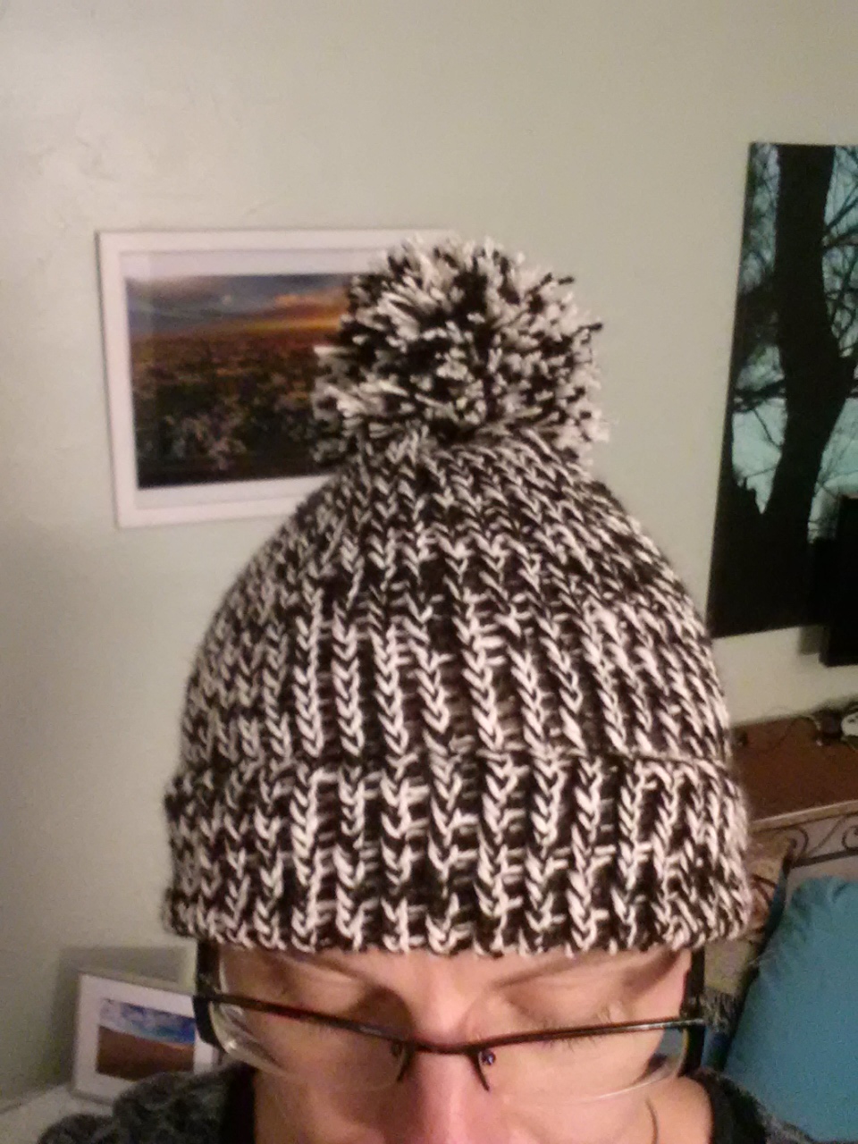 What else has happened since we posted last? So much! The usual round of barn chores, trips to buy hay, shearing, ranch maintenance, animal antics, near-disasters, and of course: knitting and spinning. Here’s the hat I finished last night…did I go a bit crazy with that pom-pom?
