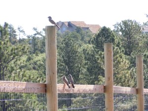 Mamma (or Dadda) kingbird shows two babies how it's done. They feed by perching on fences (trees, in the wild) and darting out to catch flies and other insects.