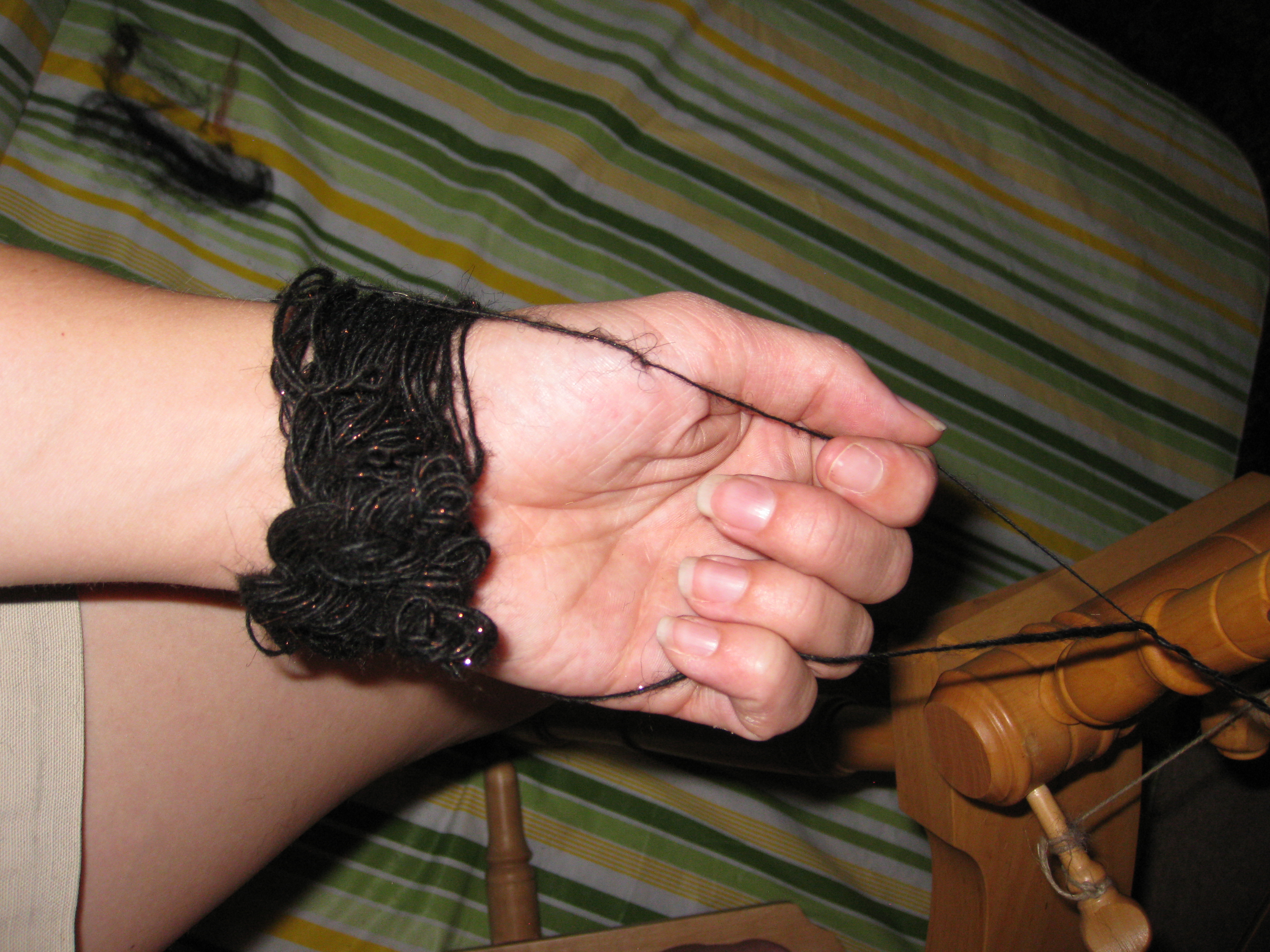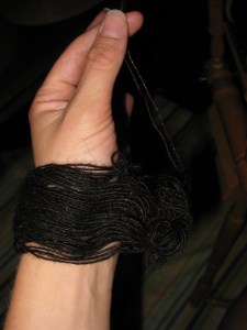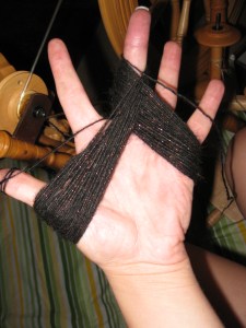 On Sunday night I spun another 150 yards of “Dark Heart” yarn. Usually I’m pretty good at ending up with two bobbins that have about the same amount of yarn on them, so I don’t have leftovers after I ply. Last night, not so much. So I decided to try this “Andean plying bracelet” thing I read about. It’s a special way of winding singles onto your hand, so you can ply from both ends of the same yarn, instead of from two different singles.