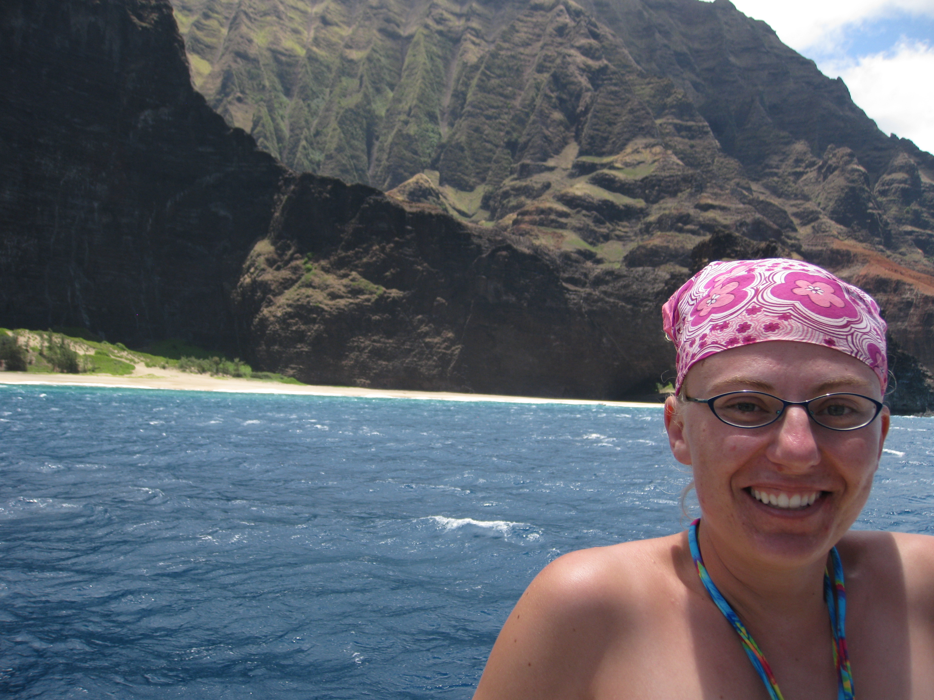 Me on the Na Pali coast, the north side. The wind was ripping, which is why I have that handkerchief tied down so rigorously.