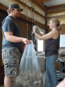 This process is (surprise) very dusty. We try to do some of it as we skirt, to keep the dust out in the barn where it belongs, at least until Mom gets the push broom out. The second pass at skirting is done as Dad feeds the fiber into the carder.