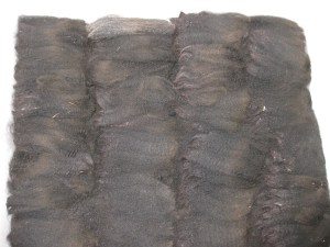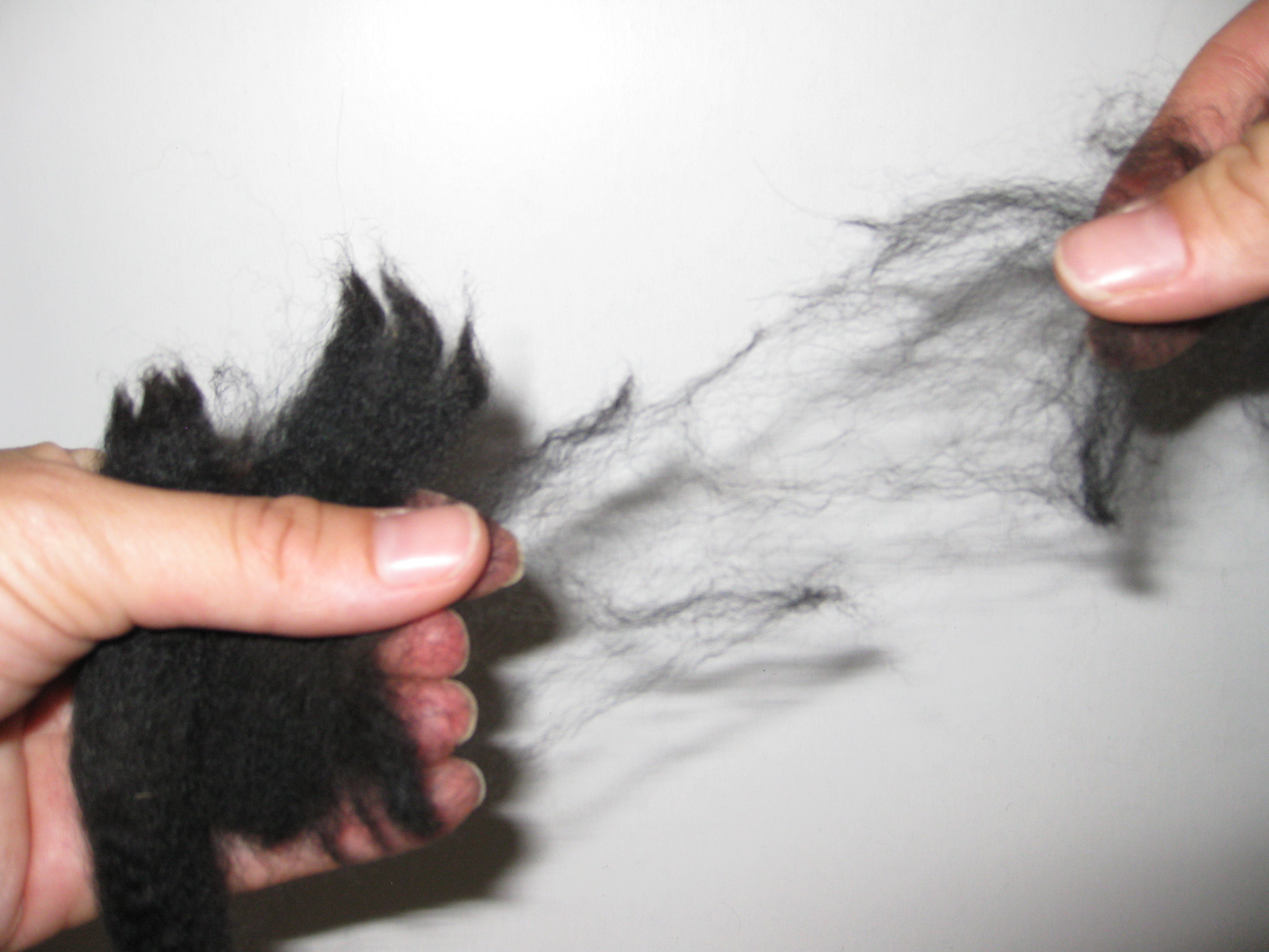 Then I hold the lock in my left hand, and use the thumb and forefinger of my right to pull on the side of the hairs. It will go from a dense bundle of fiber to a sheet so thin it’s like holding air. When the whole staple is fluffy, I put it into yet another clean plastic bag. Picking a whole fleece probably takes around four hours, although since it is usually rolled into skirting, I’m not too sure of that estimate.