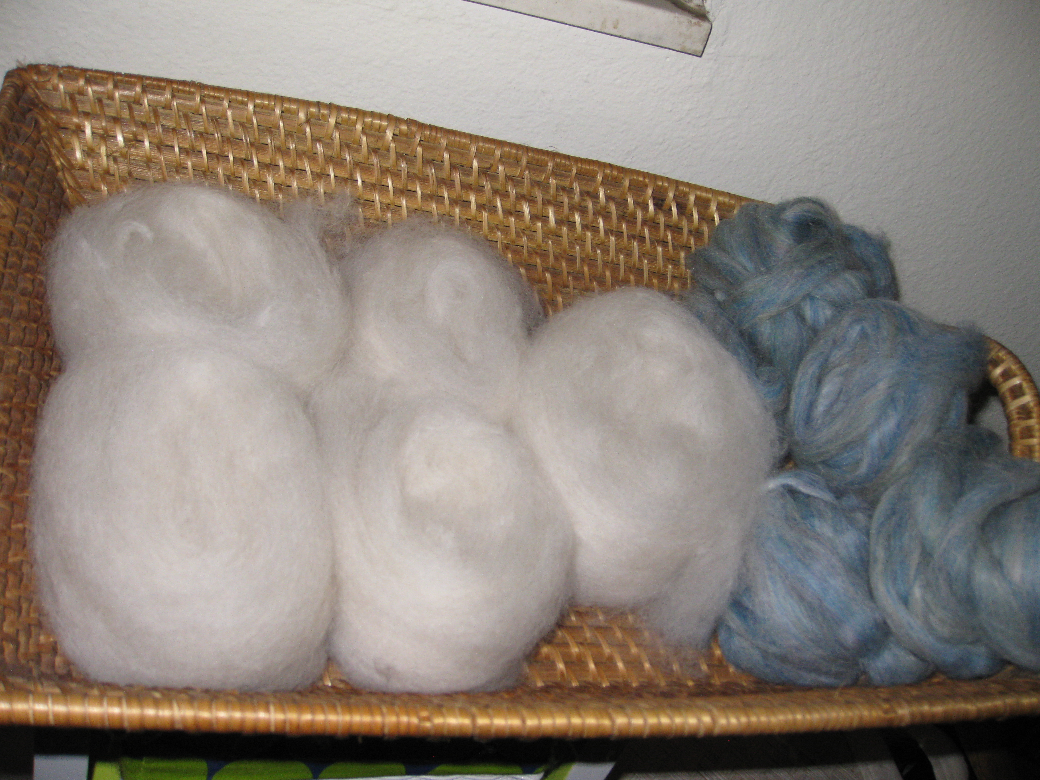 I got a box in the mail from the ranch with two freshly washed and carded batts of this deliciously soft fiber. It was kind of like pulling a cloud out of a box.