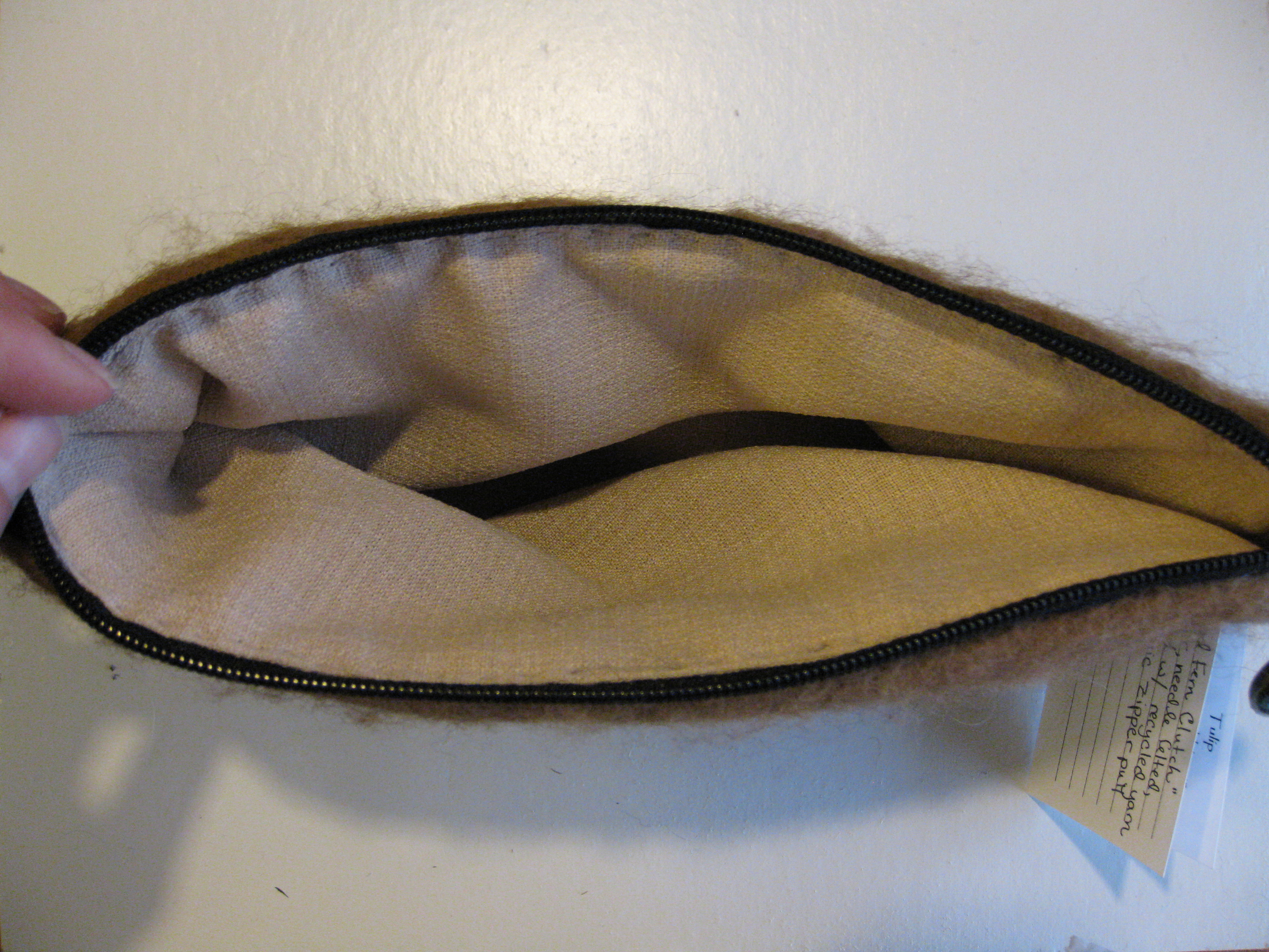 The main body of the clutch was needle felted to hold it together in the correct form, and then wet felted to shrink and strengthen it. The brown yarn I used for the ferns is embroidered on, while the green bits are made from yarn scraps that I carded back into roving and then needle felted.
