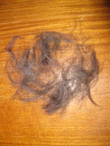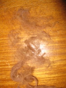 I used mulberries for color and vinegar for my mordant. And maybe it would have worked, except I forgot to do one crucial step. I forgot to separate the locks of fiber completely, so the dye didn’t penetrate to the inside of the staples. So while the mass of fiber on the left looks like it’s been dyed purple, if you look at the stuff on the right, it’s not really very purple. Tulip’s fiber didn’t want to take the dye at all. I’m not even sure what went wrong there.