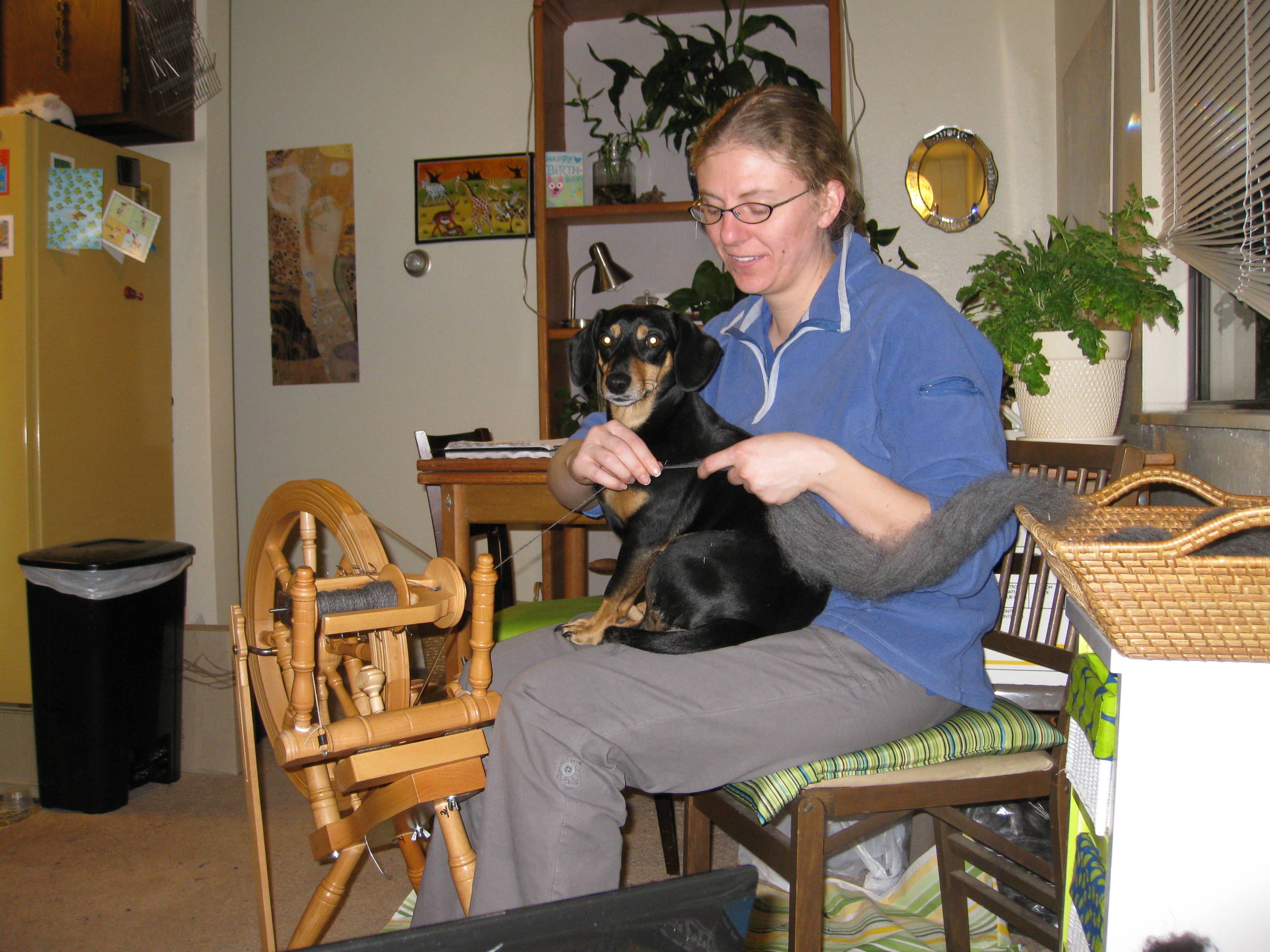 First, there was Derby. He just did not want me to pay attention to anything but him. I’ve learned how to spin around him, although it is not the easiest thing to do. Eventually I pushed him off my lap and switched to Aunt Geri’s wheel, which spins faster for plying.