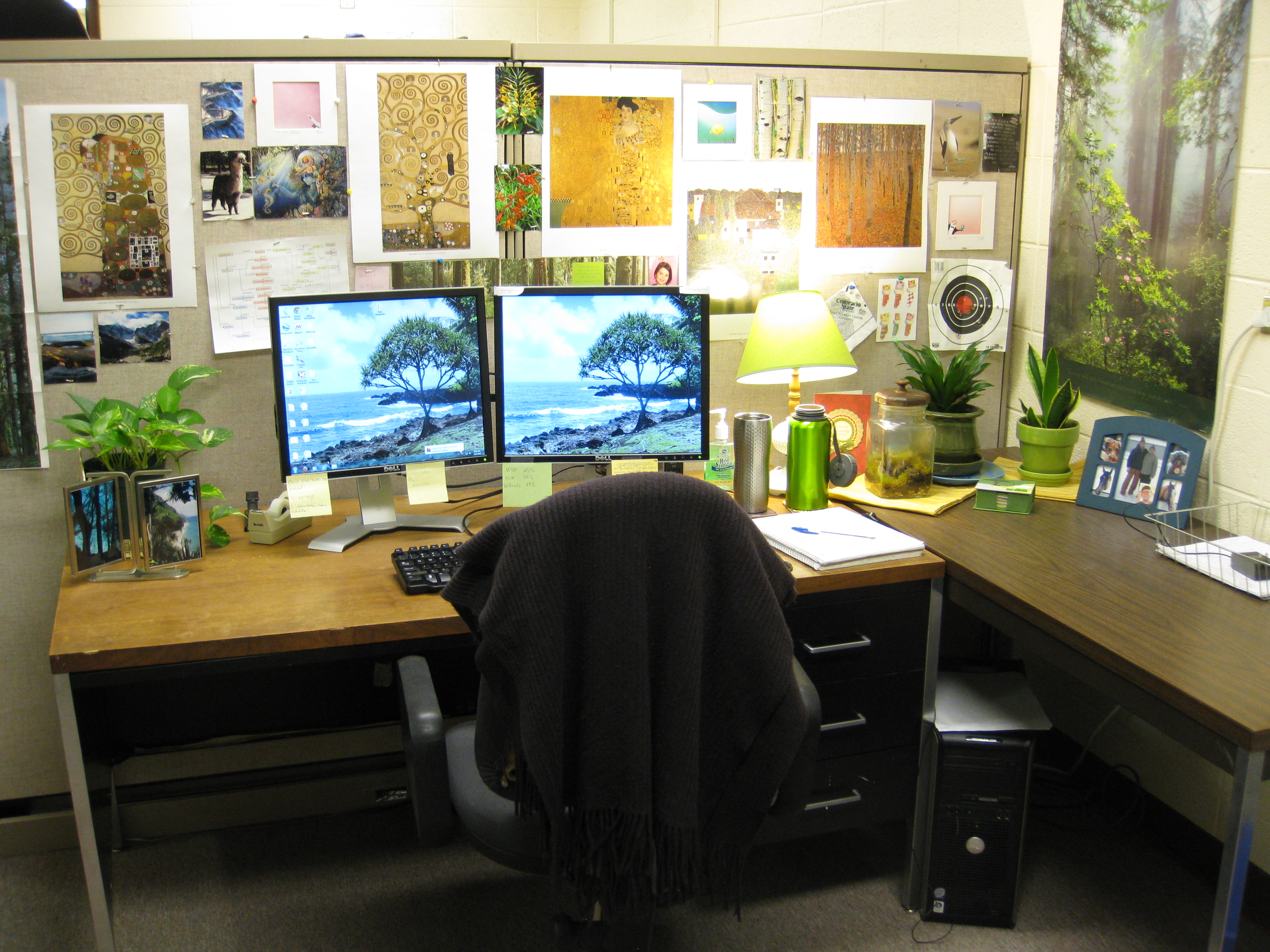I stuck with green here too and included plenty of potted plants for life. Computer programming is actually a quite creative process, so I do my best to foster that by keeping inspiration close at hand, in the form of pictures and posters of the outdoors (I work at a Natural Heritage program).