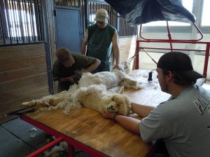The mill guy specializes in alpaca, and even this time of year (winter not being the best time to shave animals, it’s sort of off-season), there is 4-6 week turn around time. It’s much longer in the summer. He will wash, pick, and card our remaining fleeces, turning them to roving. Which basically means all we have to do is spin and knit (which are most definitely the fun parts). We’ll finish up the odd bits of fleece we have around; Mikayla’s is almost done.