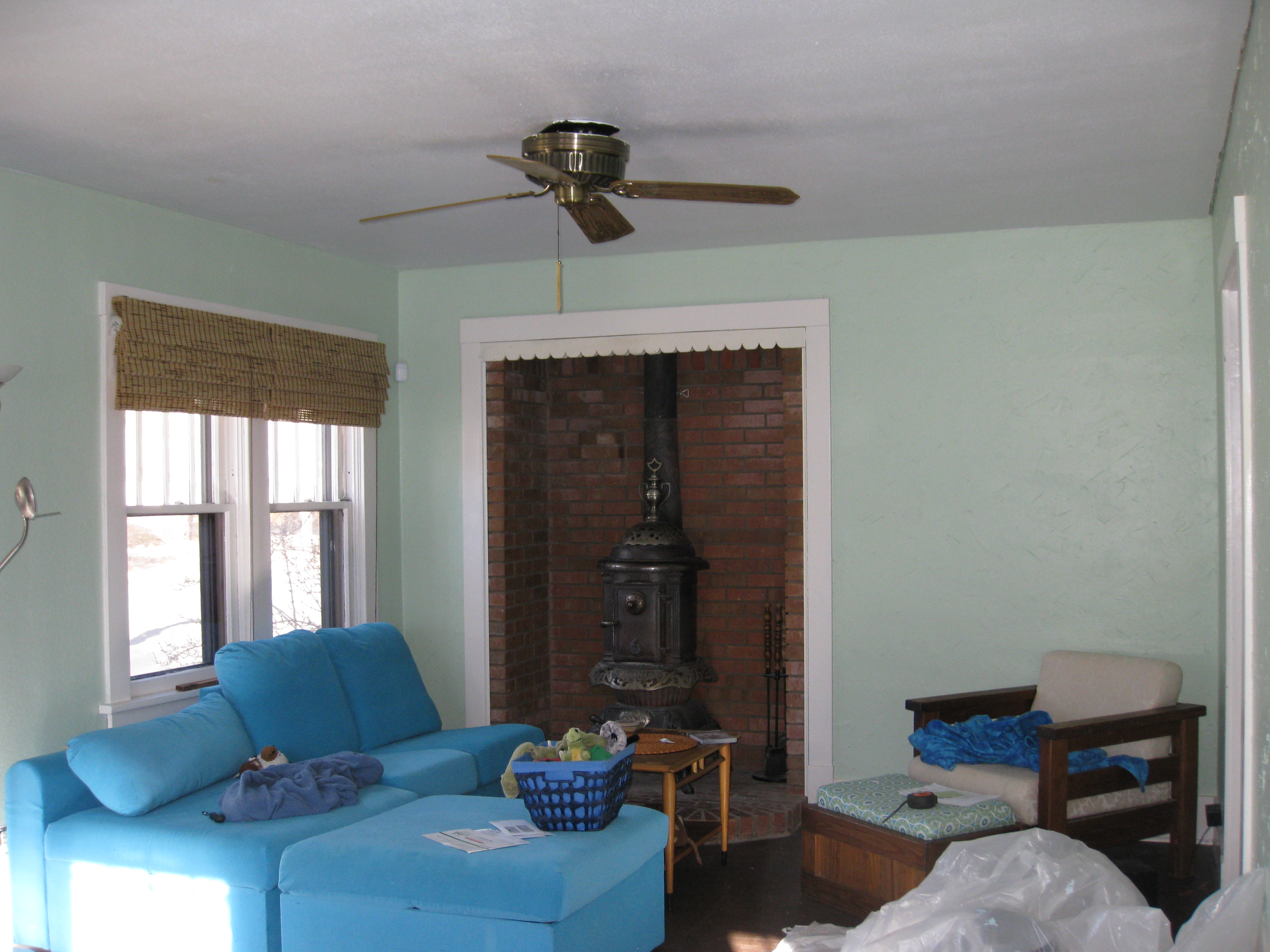 The furniture positions aren’t permanent in the after picture; I just needed them out of the way when I finished the other half of the room. The couch is blocking too much flow, and that horrendous fan has got to go, but I think the paint brightened up the room. Now the cute stove isn’t lost in a sea of red. It’ll be even better when the floors aren’t painted with maroon latex paint (shudder).