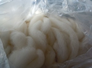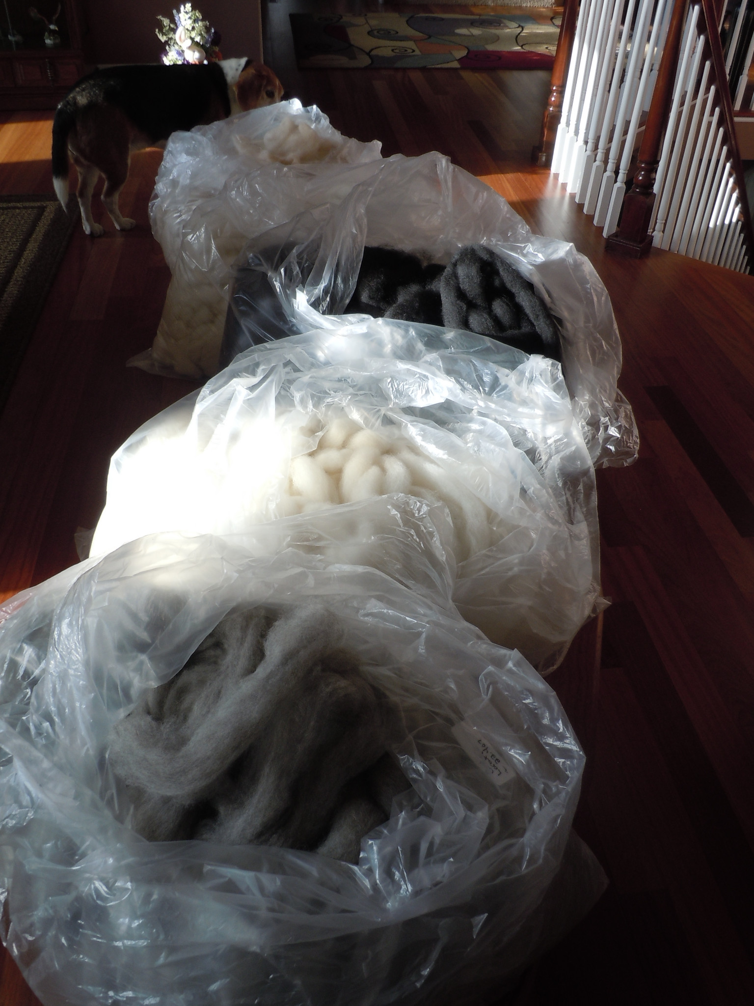 Mom and Dad sent over pictures of our roving this morning! We have five bags of roving just in from the mill, totalling almost 10 pounds of yummy un-spun fiber.