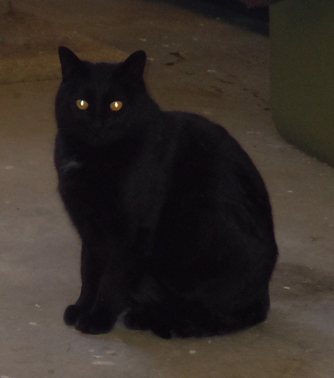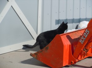 Squeaky, the larger of Mom’s two black cats (and the one with the tiny tuft of white on his chest), has become her shadow. He watches over her from the rafters while she does her barn chores. When she takes the horses out to the arena for a ride or exercise, Squeaky perches on one of the fence posts, his eyes following them around the arena.
