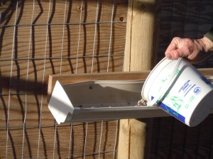We feed the ‘pacas “crumbles”, a pellet food, mostly so that we know they are getting all the right nutrients. To keep them from eating too fast and choking (see here for a harrowing choking story), Dad created a long, narrow feed trough from a rain gutter.
