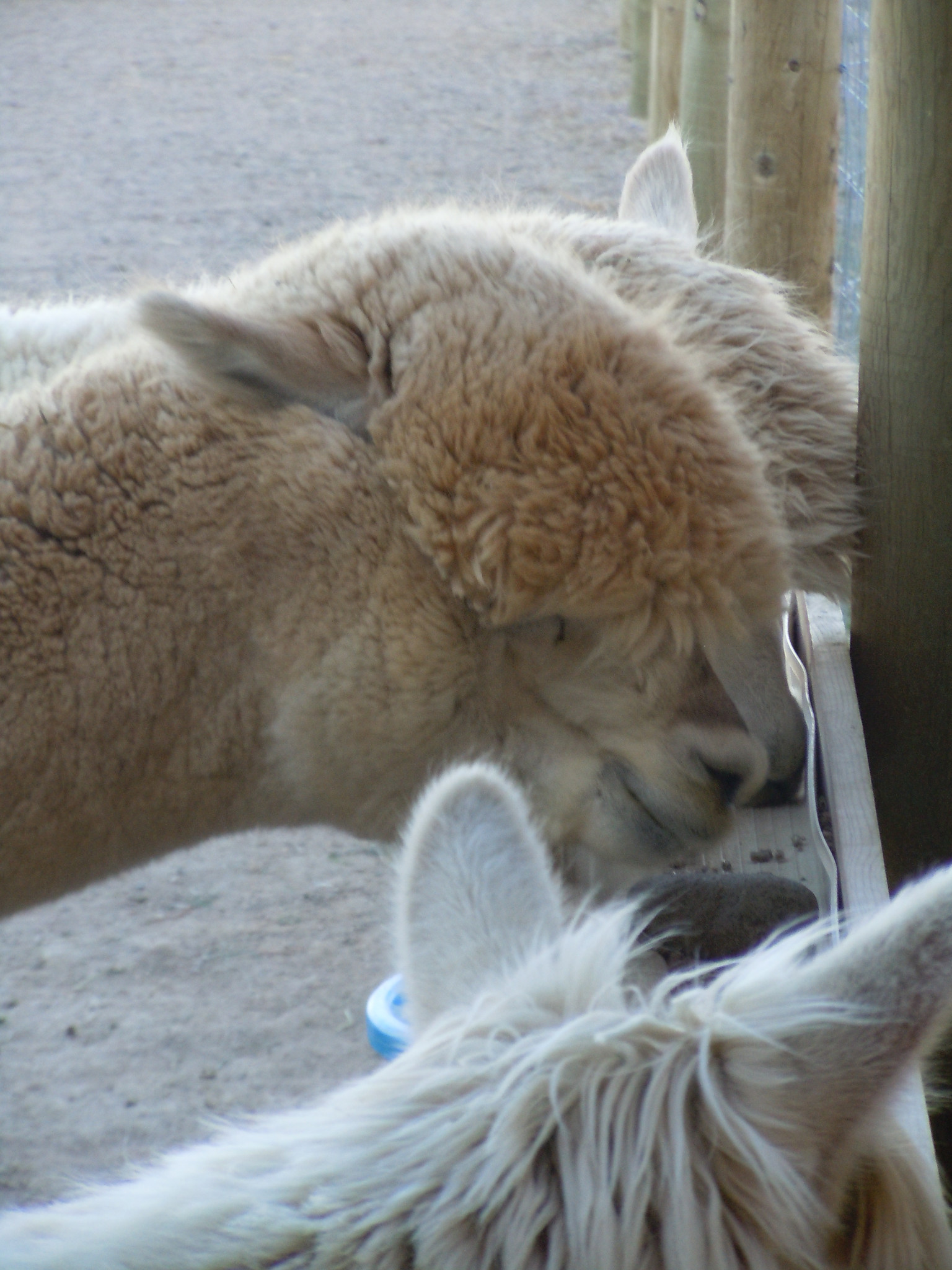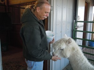 The gutter is full of round river rocks, and the alpacas have to nudge the rocks out of the way to get to the food. Except for Merlin, of course. The first time we put the crumbles in the gutter he just stared at Dad like “You are kidding, right?”