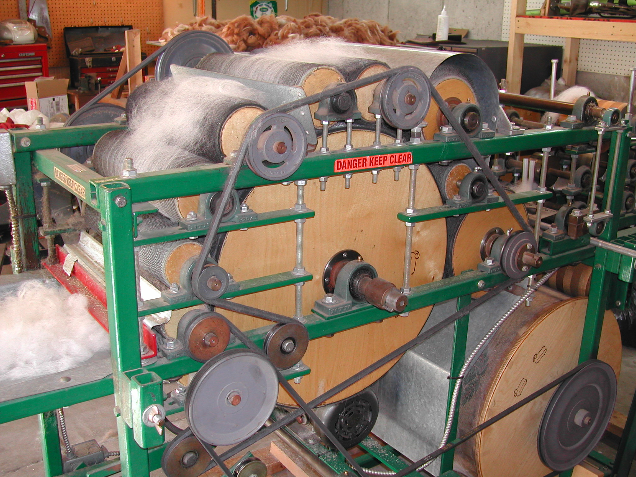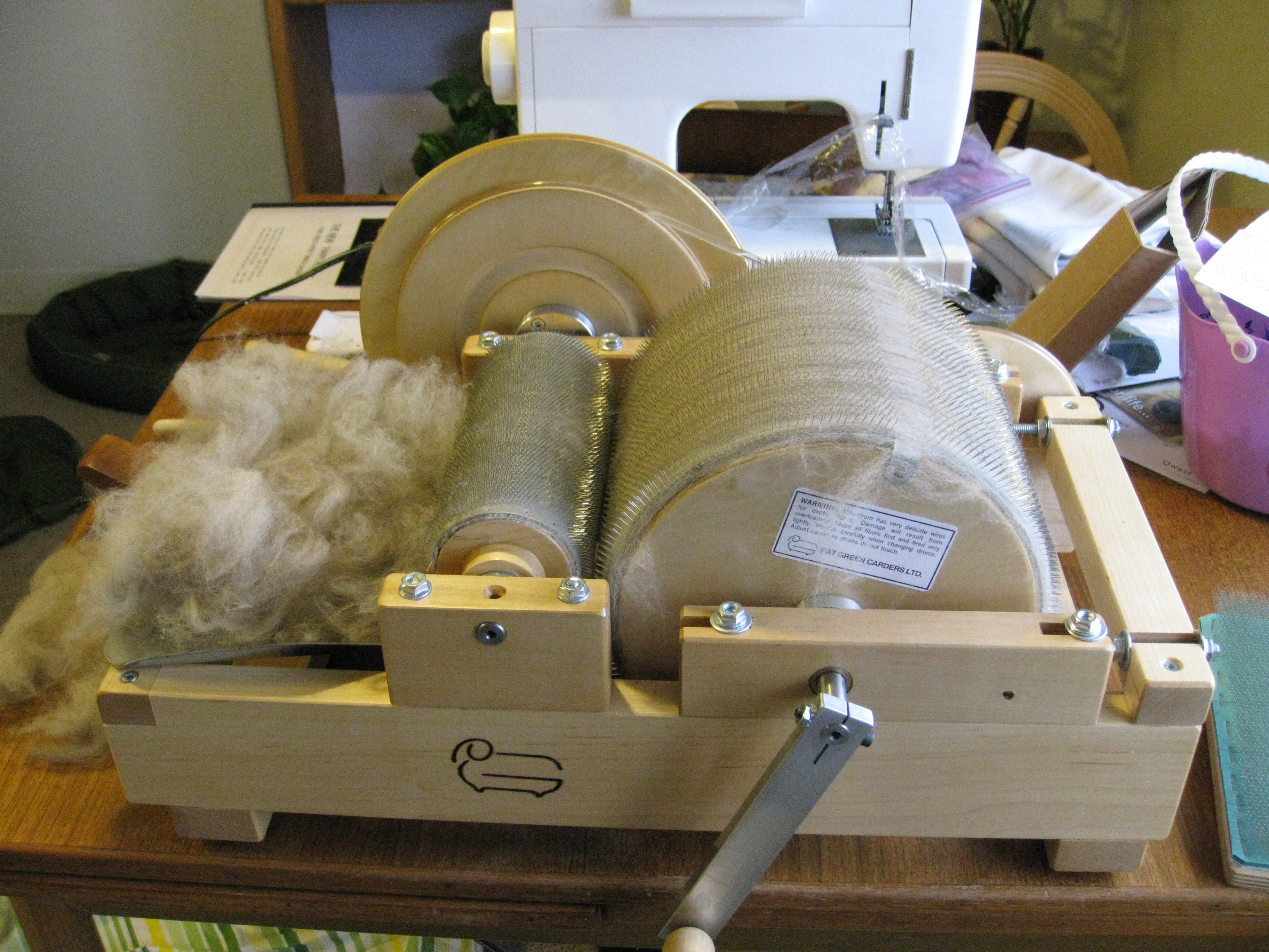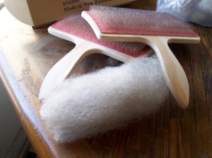 Carding is the process of organizing the fibers so that they are all pointing one direction. It’s essentially a really complicated way to brush hair that is no longer attached to an animal. There are three ways to do it: using hand carders (cheap and difficult), using a drum carder (expensive, slightly easier), and by taking your fiber to the mill (very expensive, very easy). We’ve done all three, but today I’ll focus on the hand and drum carders; the mill just uses a really large, mechanical drum carder.