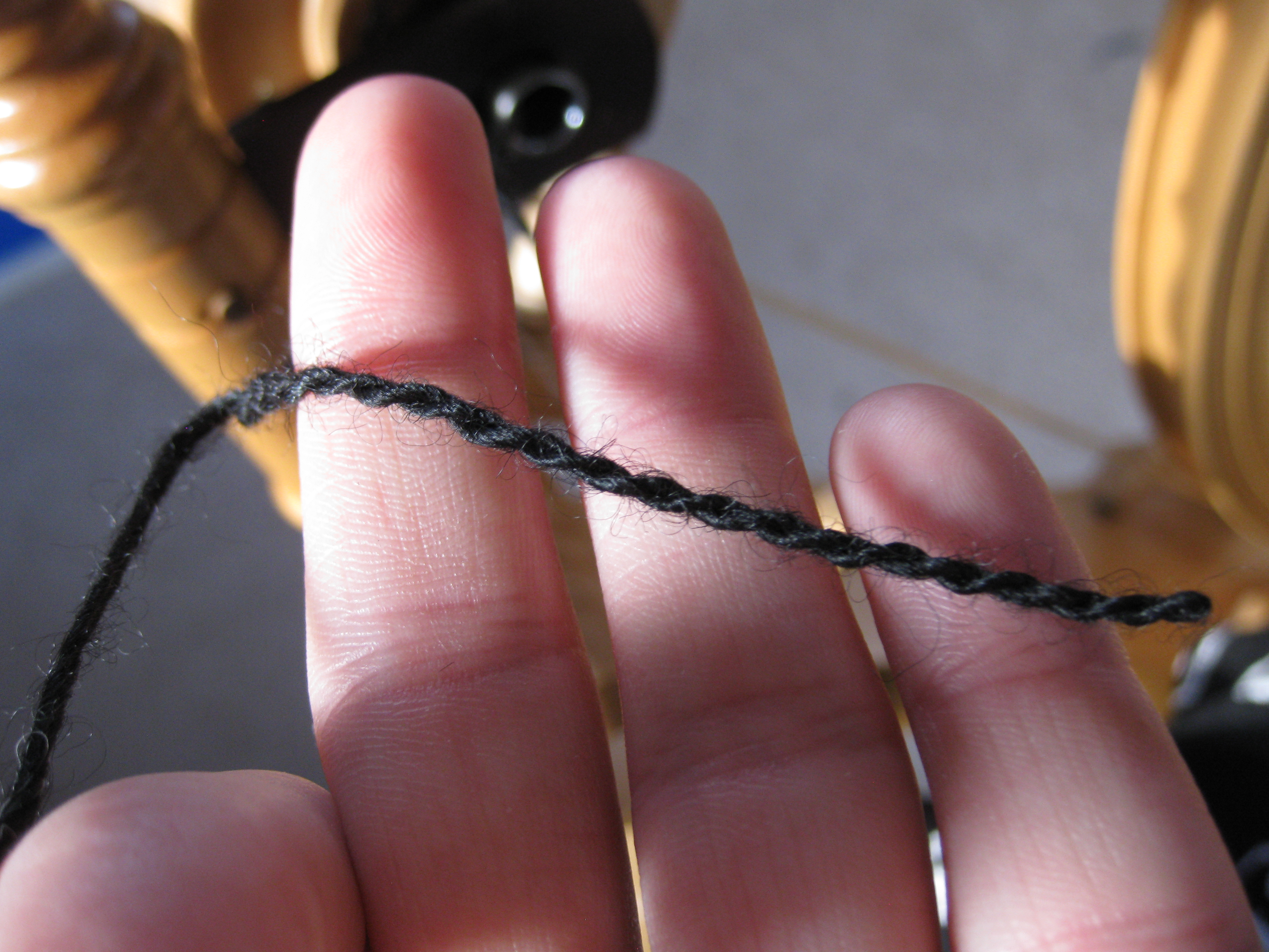 We have a ton of black roving from Brittany, so I just sat down with 2 pounds of it on the floor next to me, turned on a DVD and did a marathon spinning session. No thinking, no designing of elaborate master pieces, just spinning. One can never have too much black yarn, was my logic.