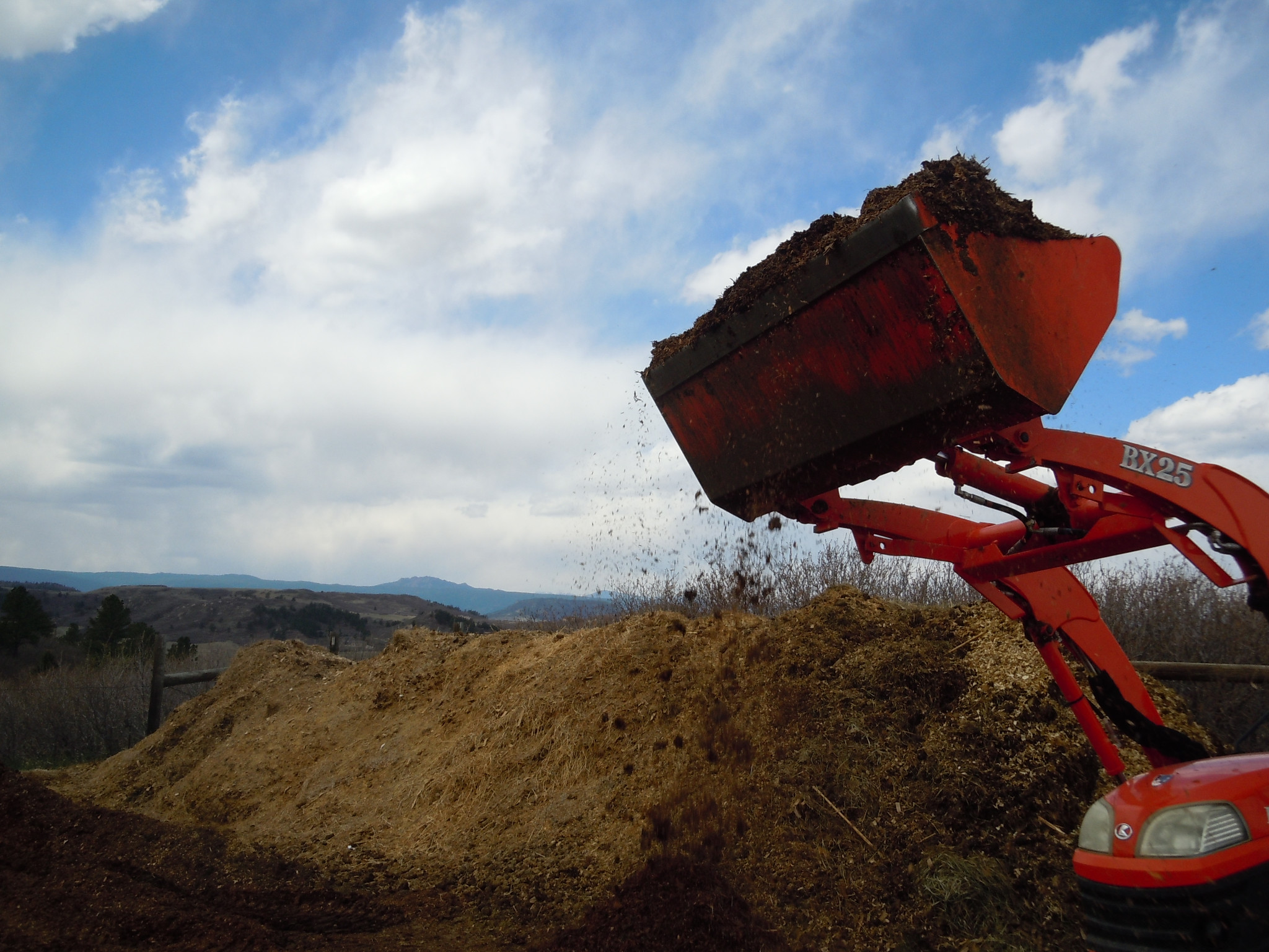 We have two compost piles, the old one and the new one. We stopped adding to the old one last fall, to give it a chance to compost. Turning poo to compost is actually fairly easy. Microbes (bacteria and fungi) do all the hard work. We turn it over using the tractor once, since the moist and warm inside of the pile is the best environment for composting. By spring, we no longer have poo at all, just a REALLY big pile of yard-enhancing fertilizer. Dad calls it “Alpaca Gold”, since it still has a slight gold tinge from the sawdust.