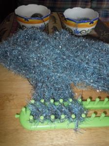 Thank goodness I’m not the only crafter in the family! Mom, who knits using a rake loom, has been busy. She knit this pile of sparkles using one strand of handspun suri alpaca yarn (that’s the gray) and one strand of blue glitter eyelash yarn.