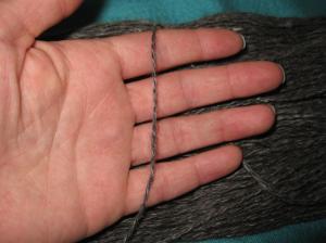 Anyway, the roving is a mill processed blend of 90% suri alpaca and 10% tencel. The alpaca part comes from Archie, a friend’s alpaca. The mill doesn’t like spinning it, I think because it is very fine, so our friend gave me two years worth of the stuff to work with. Since I spin it super lightweight, the fiber is going to last FOREVER. I don’t feel like I’ve even put a dent in the amount we have. This whole 215 yard skein weighs barely 2.5 ounces.