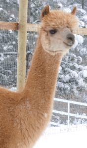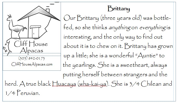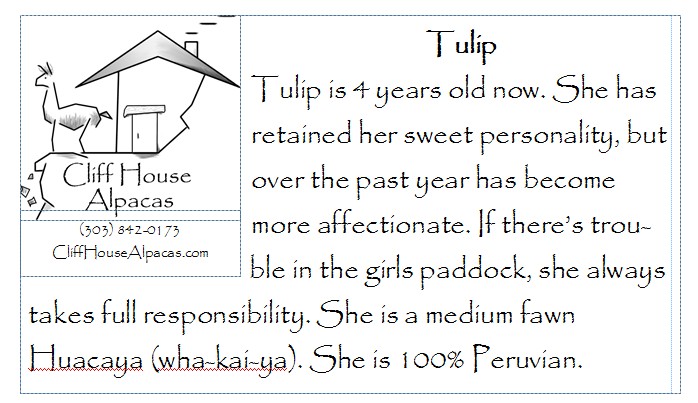 What does every enterprising young alpaca need? A business card of course! Each of our alpacas has one, which is attached to any product containing their fiber. We update them in the summer, and we’ve just finished this year’s new cards. I particularly like the picture on Tulip’s card this year, it’s definitely a glam shot: