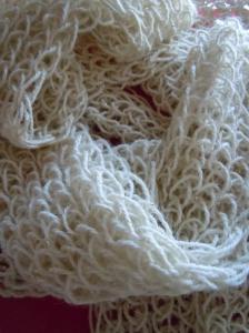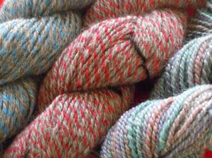 Today I get to show off some of Aunt Geri’s yarn. She has refined her cabled and multi-ply yarn techniques into a fine art. Her two newest yarns used alpaca fiber from Loredo, a friend’s alpaca (the one with sort of lumpy roving) and bamboo silk.