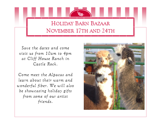 I know it’s been awhile since you heard from me, but don’t worry, we’ve been busy! Mom has been knitting, and Aunt Geri and I have been spinning like crazy for our upcoming Holiday Barn Bazaar! So if you are in the Denver, Colorado area, save either November 17th or the 24th, and come on down to the ranch to meet the alpacas.