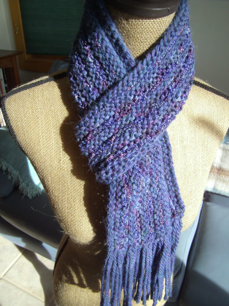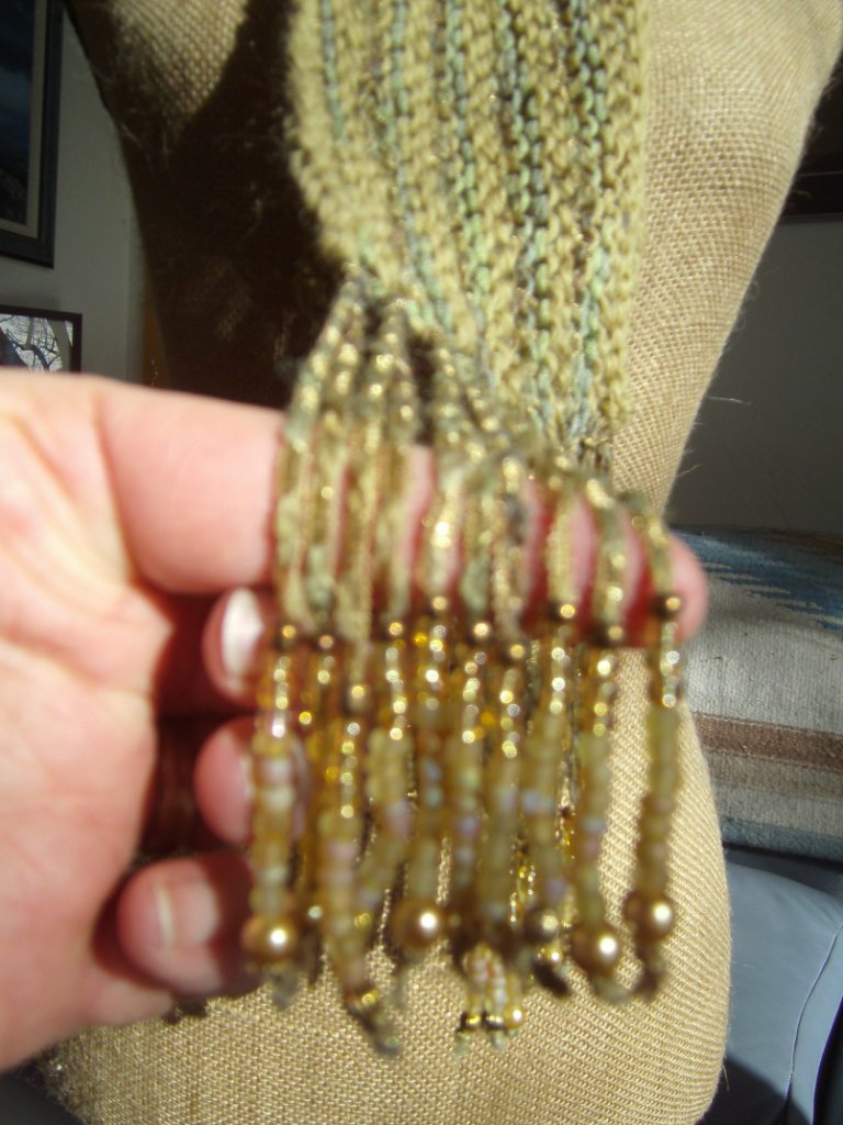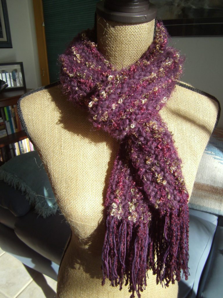 In the samples shown here, the purple is my favorite. It is so soft (alpaca and silk) and richly colored with a gold/wine accent. The blue one is made with a beautiful bulky alpaca yarn with fuchsia and aqua undertones. Mixed with sleek boucle (bumpy) yarn and shimmering ribbon, it reminds me of the winter sky in the Dakotas – BRRR! The gold scarf is the color of a timothy hay meadow – eat on little four-legged ones! This one has fringe that is embellished with glass