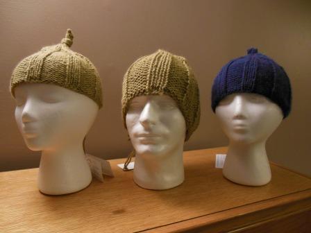 This yarn is also the base yarn in some of our “Magic Scarves”, so the hats can accompany (or not!) the scarves. The “pumpkin vine” top is made by just continuing to knit 3 to 5 stitches until it is long enough to tie a knot – I think it looks like a pig’s tail! I am making some other colors of the Rib hat and will probably make some more of these basic but fun ribbed hats in other yarns too.