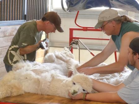 Alpacas are generally sheared once a year – Cliff House will be shearing in early May this year!  A single alpaca can produce 3 to 10 pounds of fleece annually, but more typical yields are between 4 and 5 pounds, depending on the density of the fleece.  The fleece from a mature alpaca is normally between 3 to 6 inches in length – important only to us spinners!  But, the yield from one alpaca is typically enough to make only a single sweater!  All in a year’s work…………..