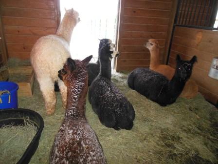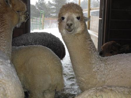 Happy Monday everybody, Dad here. If you’ve ever wondered what the Alpacas think of snow and wind, Saturday’s spring storm will give you an idea of what it’s like. Where the girls like to “kush” (a position where the alpaca folds its legs under its body to rest or keep warm), the boys tend to stand and complain to one another. The snow itself, doesn’t seem to bother them at all, but the wind drives them into the barn.