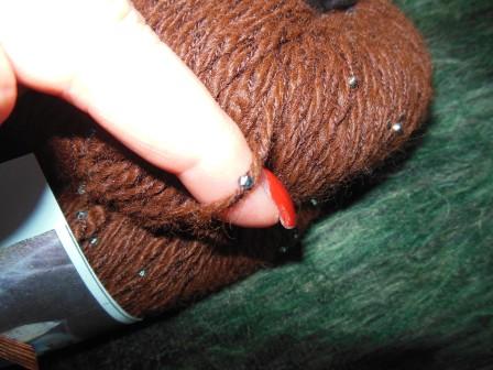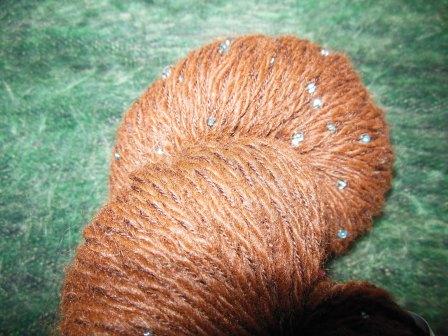 Placing one bead every seven or eight inches takes approx. 1300 beads-strung along 250 yards of yarn. This takes a very long time.
