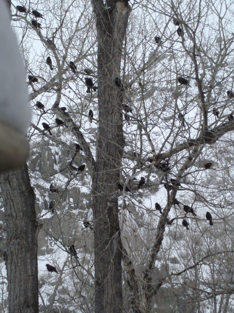 Plying is very relaxing; I usually watch the birds, since I don’t need to look at the spinning wheel. You can see my view of the birds from the feeder – mostly house finches, gray-crowned rosy finches, chickadees, juncos, and occasionally magpies and crows. The second picture shows the pending invasion of red-winged blackbirds – it’s like a Hitchcock movie! We have never had them visit before and the flock is huge!