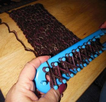 I tore out the scarf a second time, by now feeling a little silly, and began on my blue loom. This is the loom I use when I knit my shawls. The pegs are smaller and closer together producing a tighter and more tailored stitch. I hope you can see the difference. Third time’s a charm!