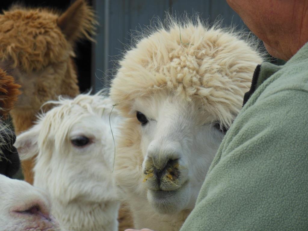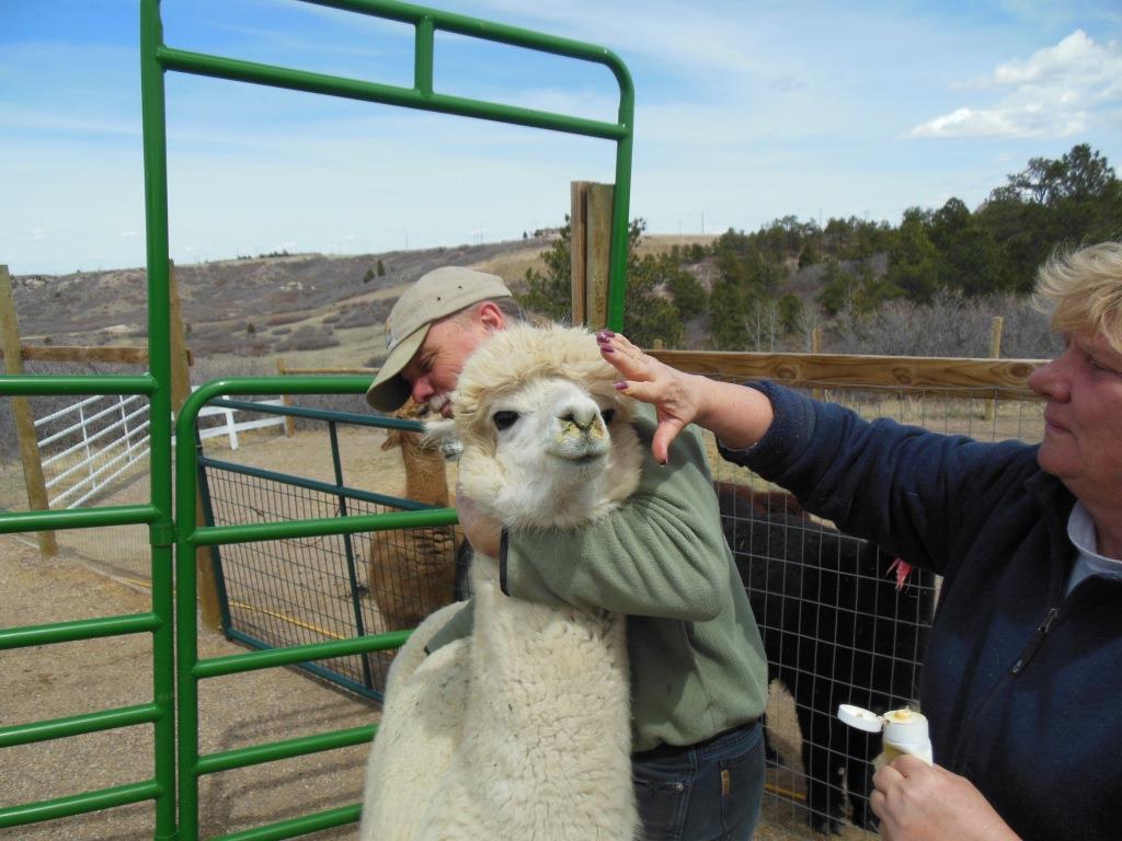 The process involves catching him, holding him and then creaming up his muzzle. This is not as easy as it sounds. It’s always a two man project, but if you want pictures it’s a threesome, not including the alpaca.