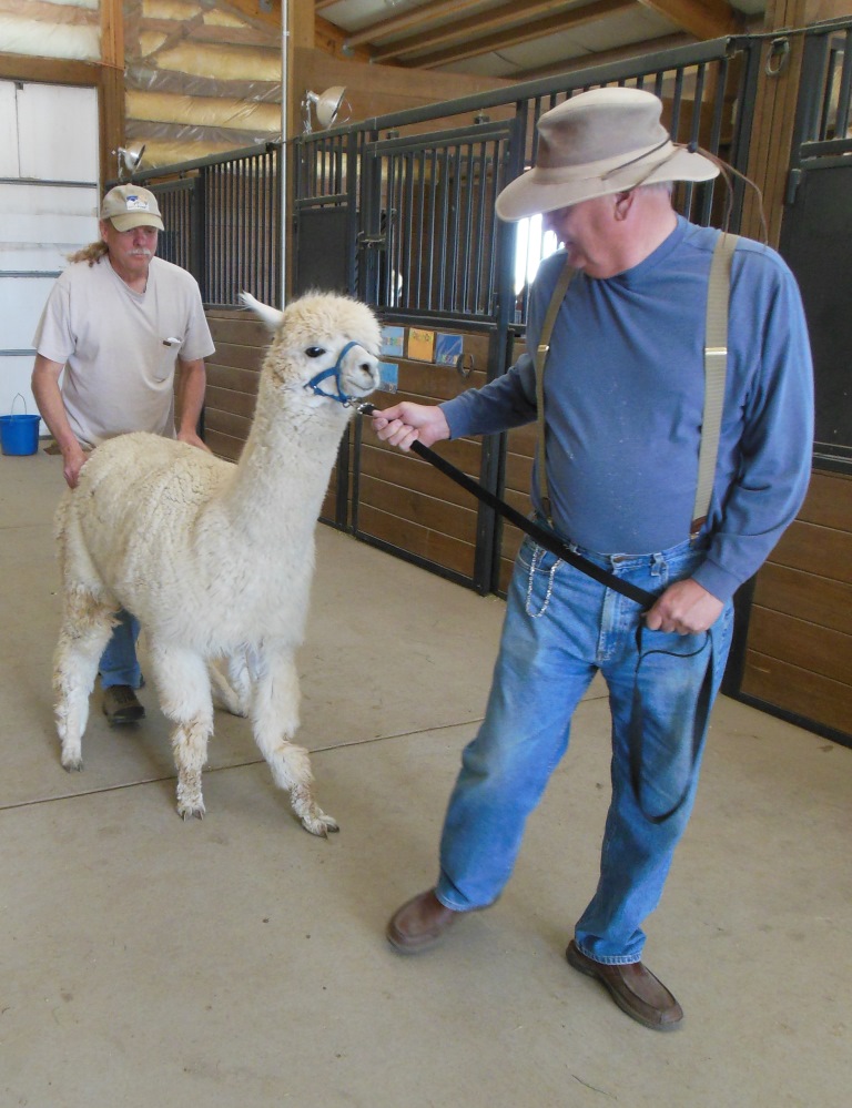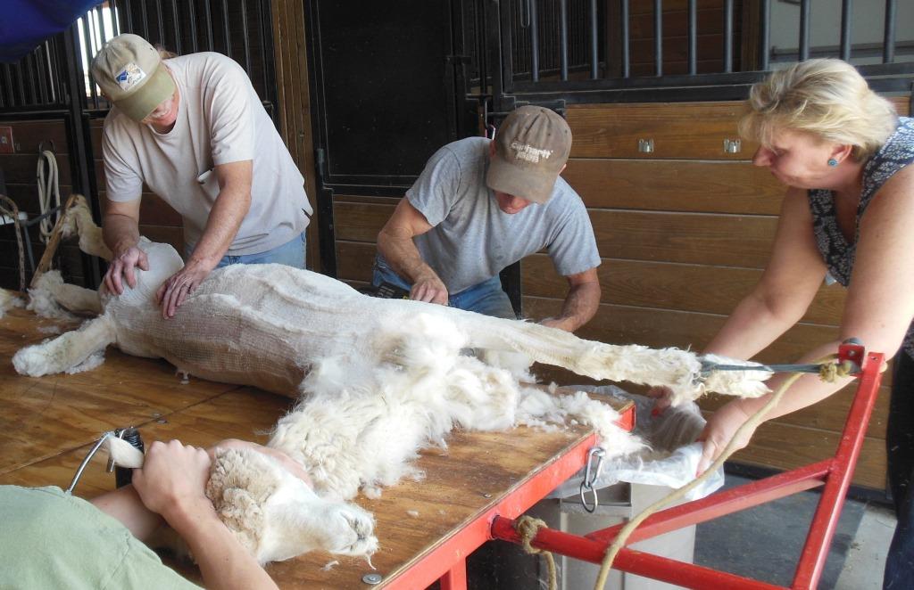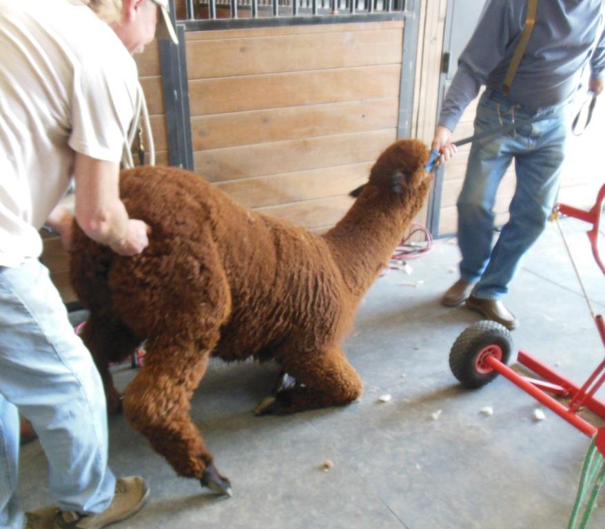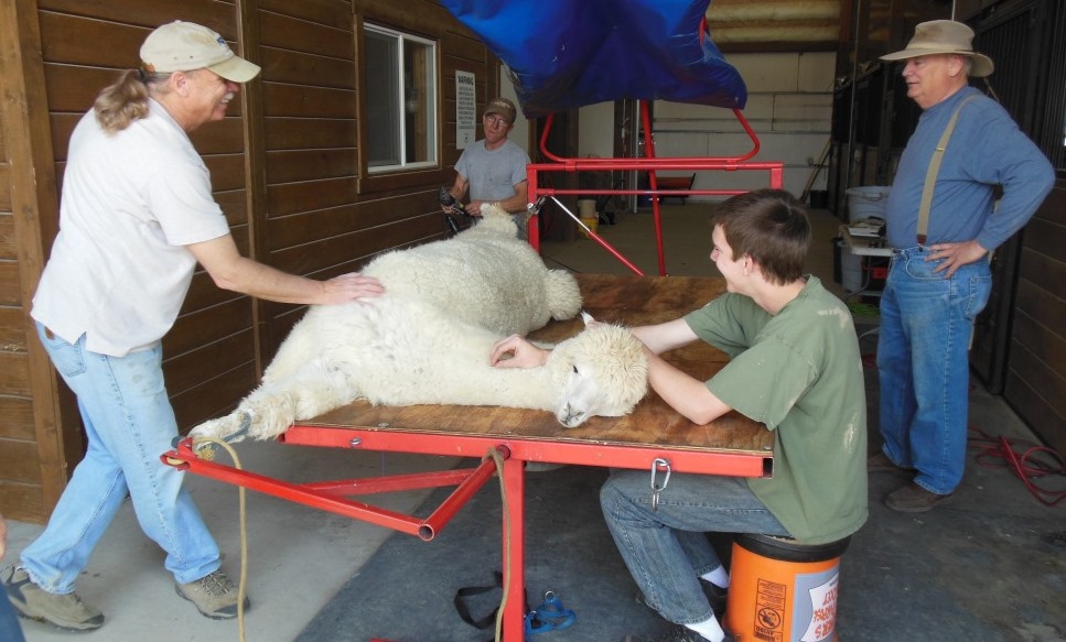 Speaking of raising alpacas, Tripoli humbled me the minute Dad and our friend Roger attempted to walk him down the breeze way. Trip literally had to be picked up all the way to the shearing area, and then raised up onto the table.