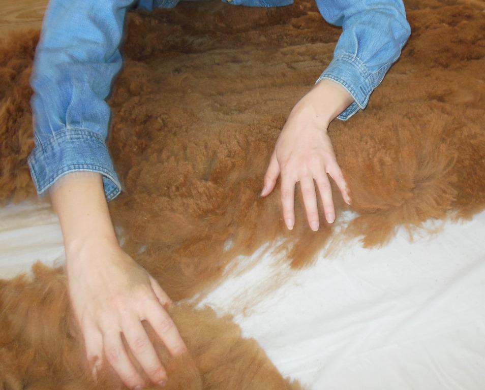 Because we use a shearing table, and don’t shear off the floor, our blankets come off the alpaca in half sheets. The fleece is gathered up off the table and taken into our tack room where Kirstin does a first skirting. Anything not too dirty or too short is saved with the neck fiber (seconds) and will be used for rugs and felting.