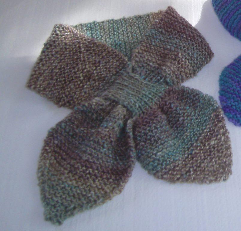 Aunt Geri here. These are just the most fun little scarves! They form a bow by slipping one end of the petals through a keyhole slot on the other end. Customers love them for family or friends that are always “chilly” or those who don’t want a scarf with long tails to bother with. We think of them as fabric jewelry too.