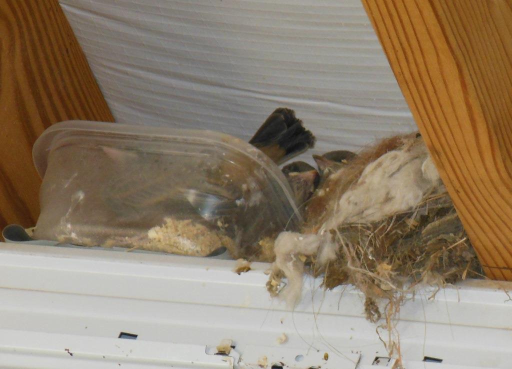 This year soon after shearing, the Kingbirds moved back in again. They improved on our design by adding a lovely north wall made of alpaca fiber. I was overjoyed to see the five babies climbing in and out of the plastic storage container. The family has incorporated it into their grand design; making their home this year a spacious duplex.