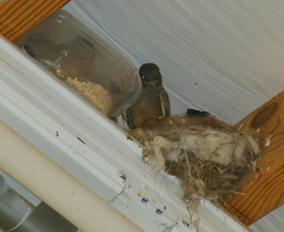 About this time last year, Aunt Geri, Uncle Jerry and I helped a family of Western Kingbirds, also known as flycatchers, by improving their nest design. A baby fell out of the hastily built nest on the fluorescent light fixture above the hay stall, and we duct taped a plastic food storage container next to the way too small nest.