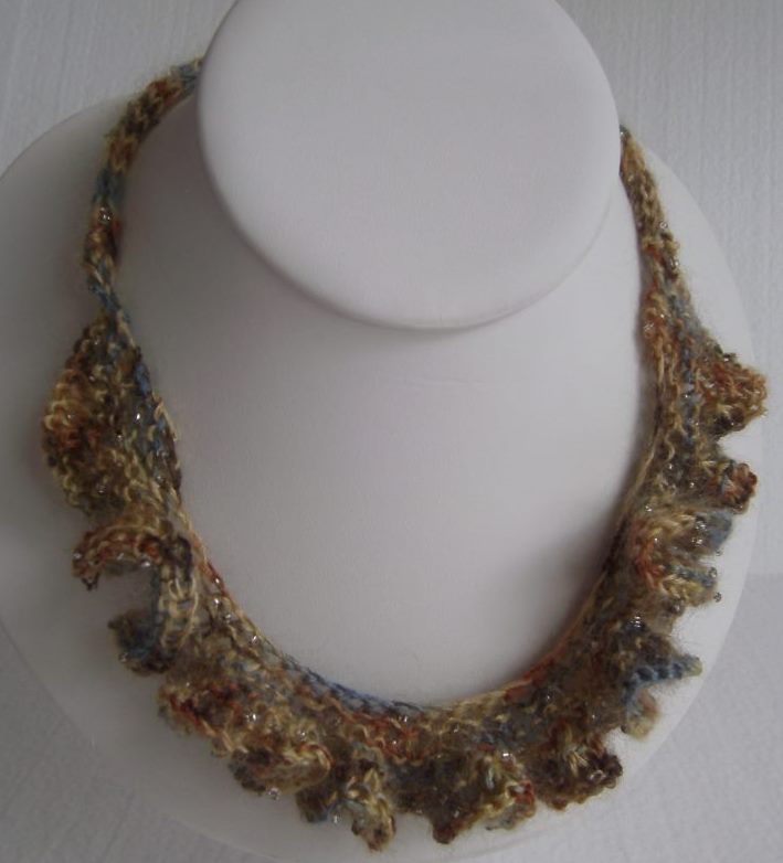 All of the necklaces are made with alpaca/silk blend yarn – the silk provides a little more strength. I practiced on a yarn that was already beaded and the “Raven” yarn that I recently spun. Then I moved on to the beaded one which is really dramatic.