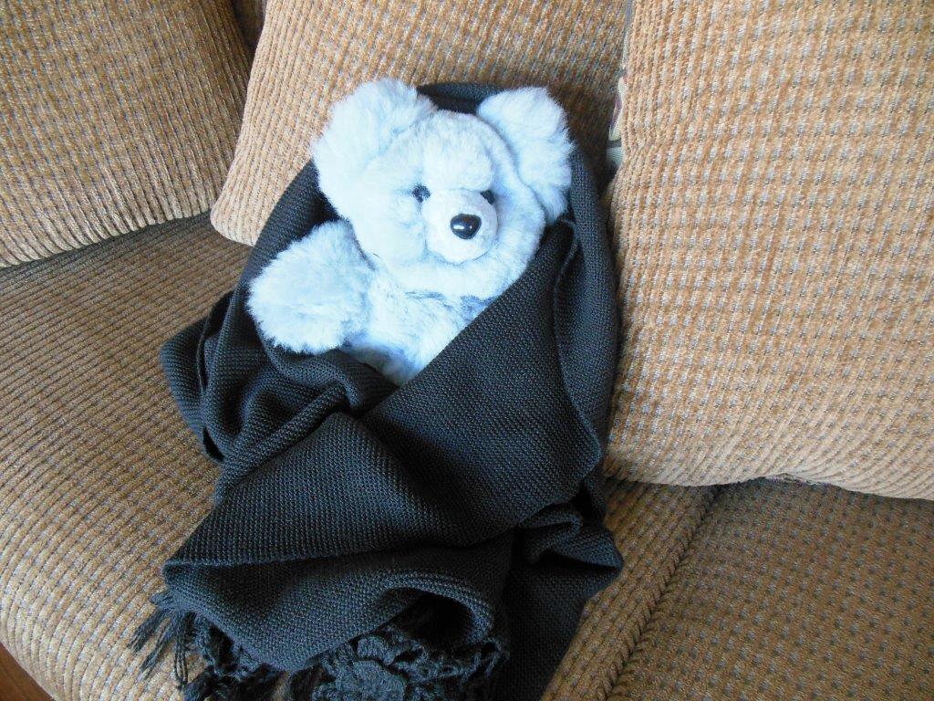 “Bear in Blanket.” Grey Bear snuggled up in a 100% alpaca knit shawl with crocheted roses on the edges. Price: $40.00.