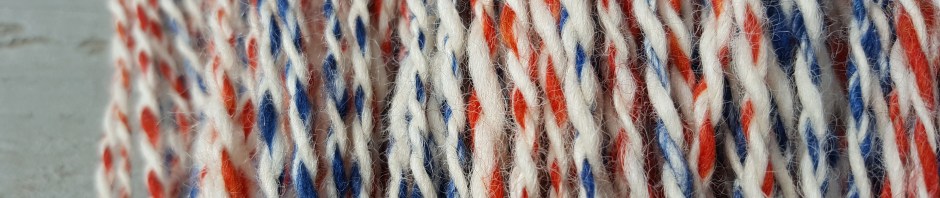 I actually spun this one on Memorial Day, and it is appropriately patriotic. I spun it by alternately marling red and white, then blue and white. I don’t have a scale on me, so I just had to guess at quantities. I changed hooks every time I changed colors, to make the estimating easier.